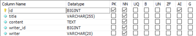 수정 후 테이블 상태 (BOARD 테이블의 writer_id와 writer는 각각 USERINFO의 id와 username 컬럼을 참조한다.)